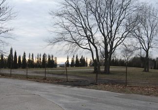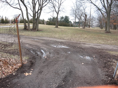 Okay, we've gone down the one-way (plenty wide) road, around the bus, and here's the way west (distance and zoom): A little pavement could help a lot here...
